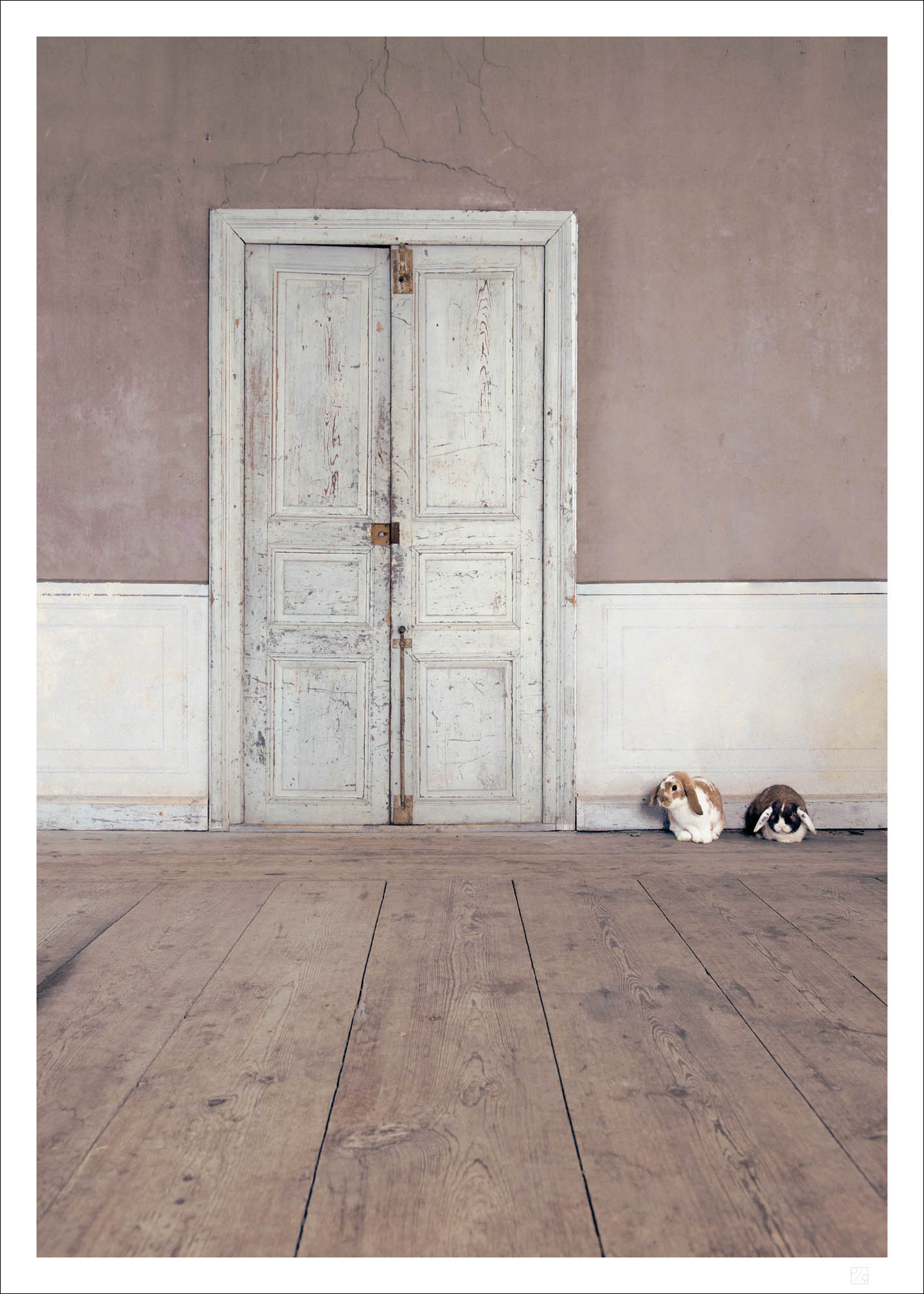Kaninchen und rosa Wand. Ein weiteres cooles und künstlerisches Poster mit Bill und Bello, unseren beiden Kaninchen, die darauf warten, dass die Tür aufgeht und sie hineingelassen werden. Ein perfektes Poster für das Kinderzimmer.