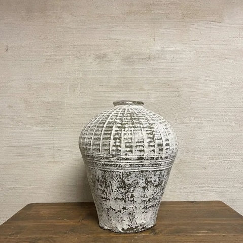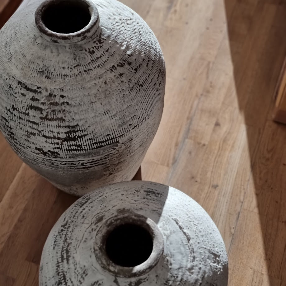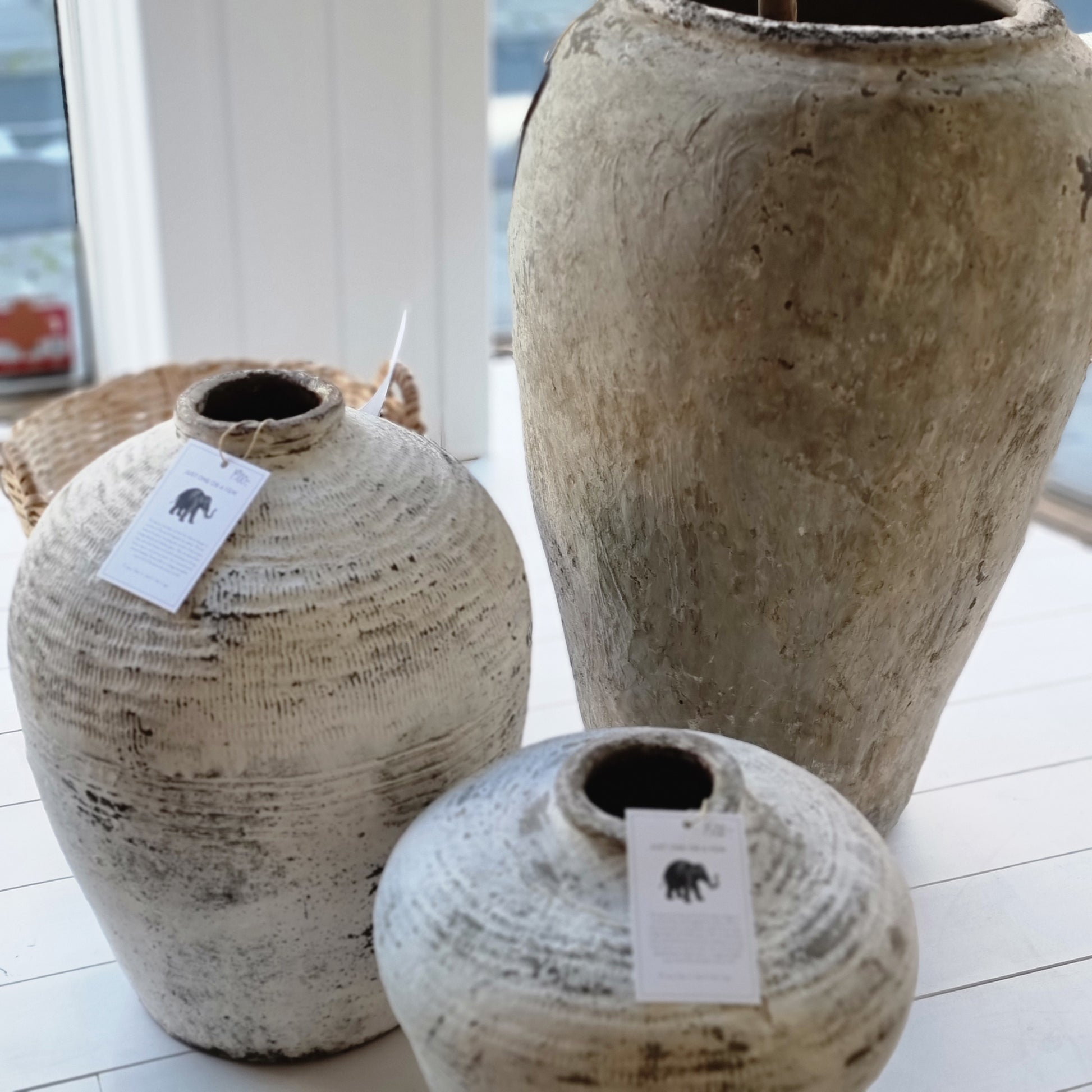 Fantastische 100 Jahre alte chinesische Töpfe. Ursprünglich zur Lagerung verwendet. Die weiße Kalkoberfläche wurde später hinzugefügt und kann im Laufe der Zeit verblassen. Form, Farbe und Größe können von Topf zu Topf variieren.