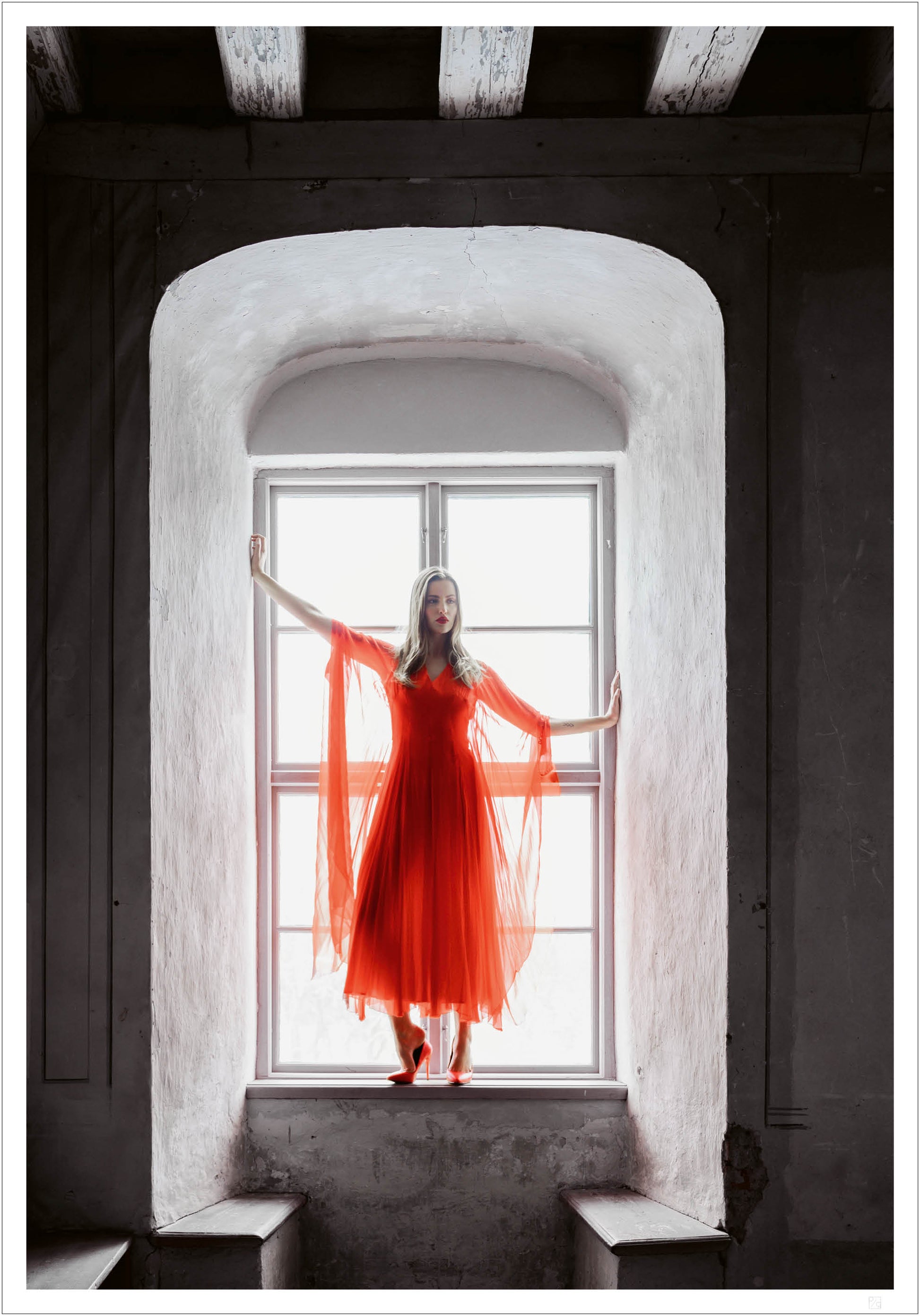 Wunderschönes Foto-Kunst-Poster einer Frau, die in einem großen Fenster posiert. Die Sonne scheint durch ihr schmeichelhaftes rotes Kleid und das Poster vermittelt ein Gefühl von Stärke und Unabhängigkeit.