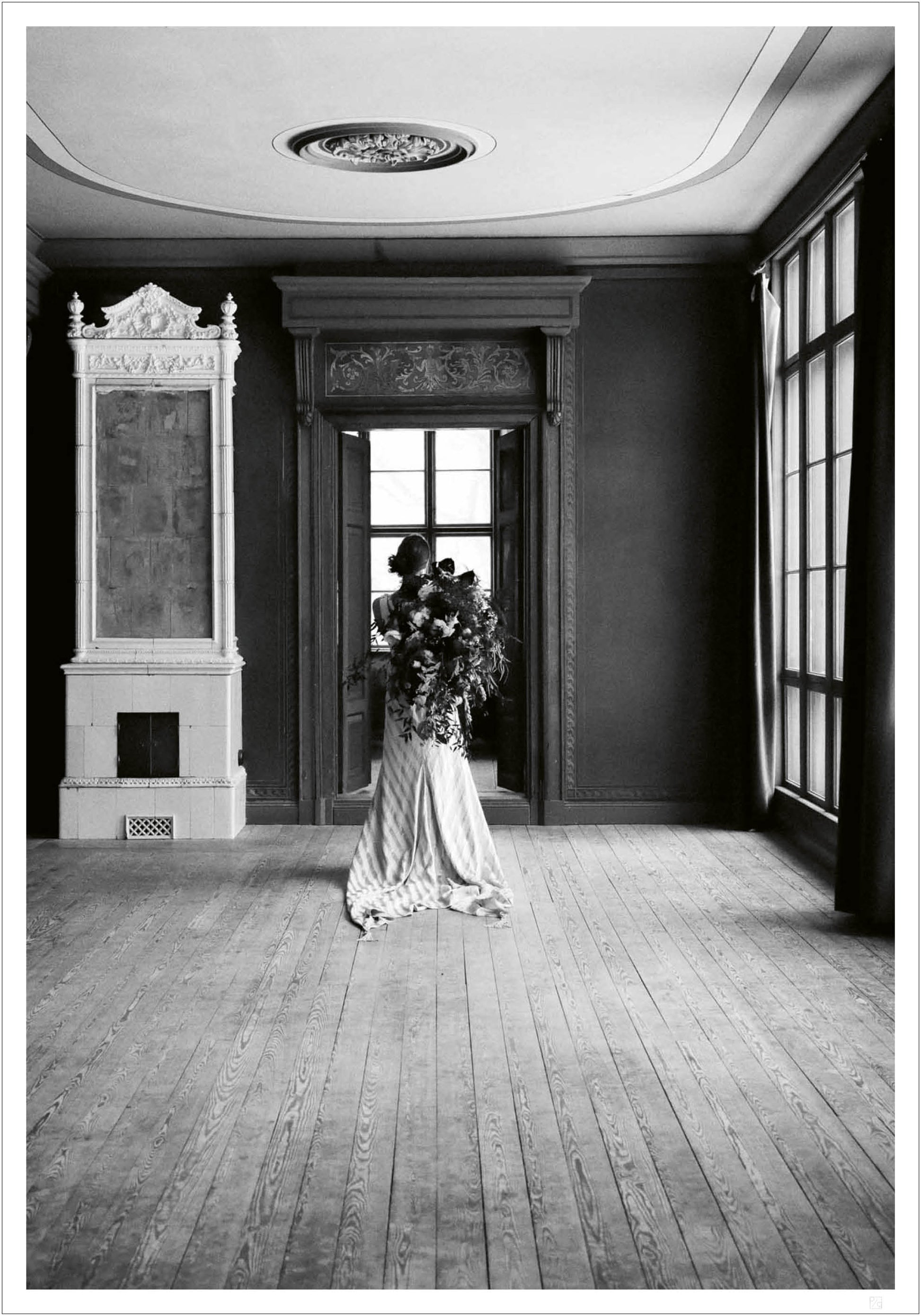 Poster in Schwarz-Weiß von einer Frau, die einen Blumenstrauß über der Schulter trägt und durch einen Korridor in einem alten Schloss geht. Dieses stilvolle Modedesign wird ein zeitloses Element in Ihrer Dekoration sein und lässt sich perfekt mit unseren anderen Schwarz-Weiß-Postern kombinieren.