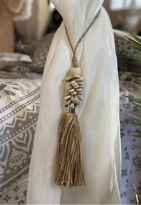 A piece of island soul — handwoven raffia strands adorned with cowrie shells, long revered as symbols of protection and ocean magic. Use it as a curtain tieback, a decorative tassel, or simply let it hang free as a bohemian detail in your home.