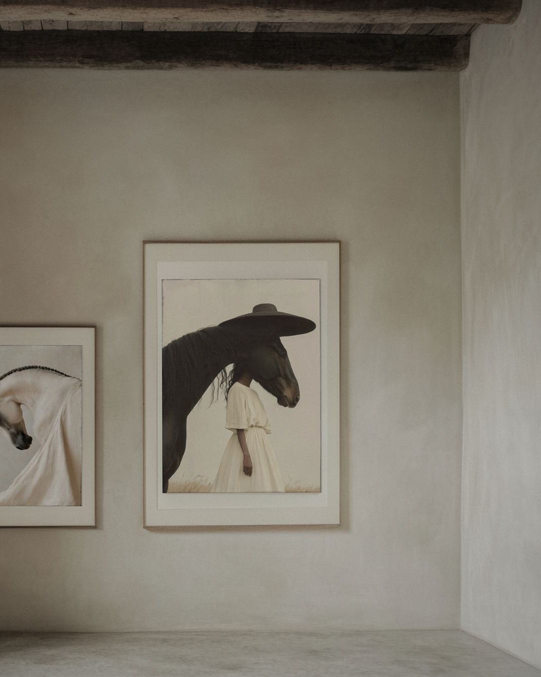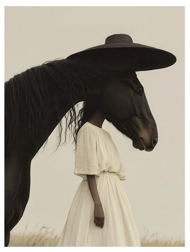 “Insight” is a meditation on the quiet, unsettling power of horses — and the moments when wildness and tenderness collide. A dark horse, wearing a hat like a shadow of mystery, stands alongside a girl in a flowing white dress, evoking contrasts of strength and vulnerability, speed and stillness, earth and spirit.