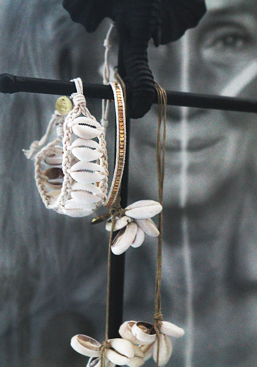 Delicate yet bold, the Nori Shell Row Bracelet by Love Warriors is a handcrafted piece woven with intention. A row of mat, soft shells is carefully tied together with natural yarn, creating a bracelet that feels both grounded and ethereal.