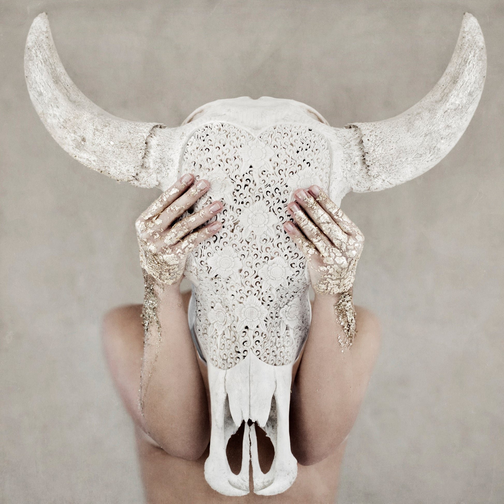 “Paint It Gold” is an ode to ritual, reverence, and the fierce poetry of womanhood. A muse stands in quiet ceremony, holding a beautifully carved bull cranium — white horns curving like ancient crescents, her hands brushed in shimmering gold as if touched by sunlight or myth.