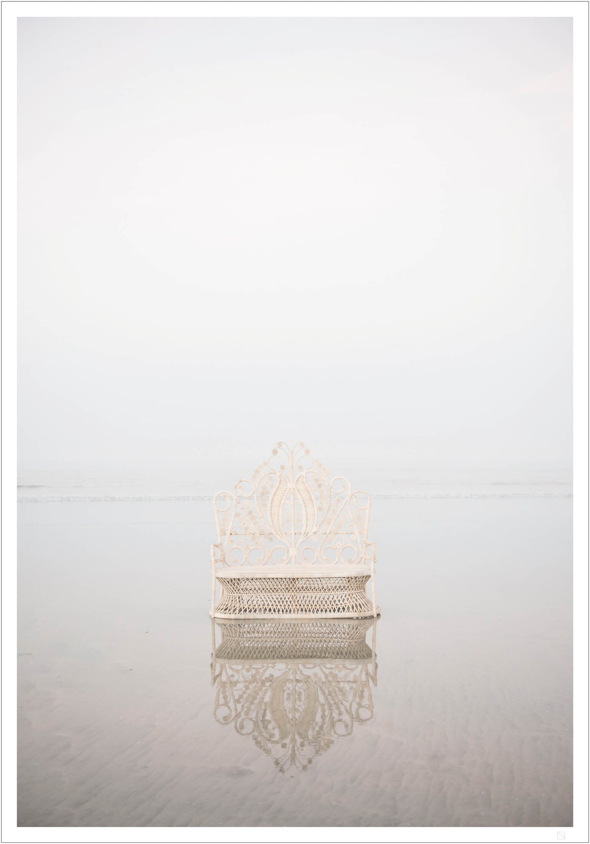 Kunstposter eines Rattansofas, das sich wunderschön in den Wasserspiegeln spiegelt. Ein verträumtes Foto, das an einem frühen Morgen bei Sonnenaufgang am Kuta Beach auf Bali aufgenommen wurde und perfekt an die Wände aller bohemianischen Häuser passt.