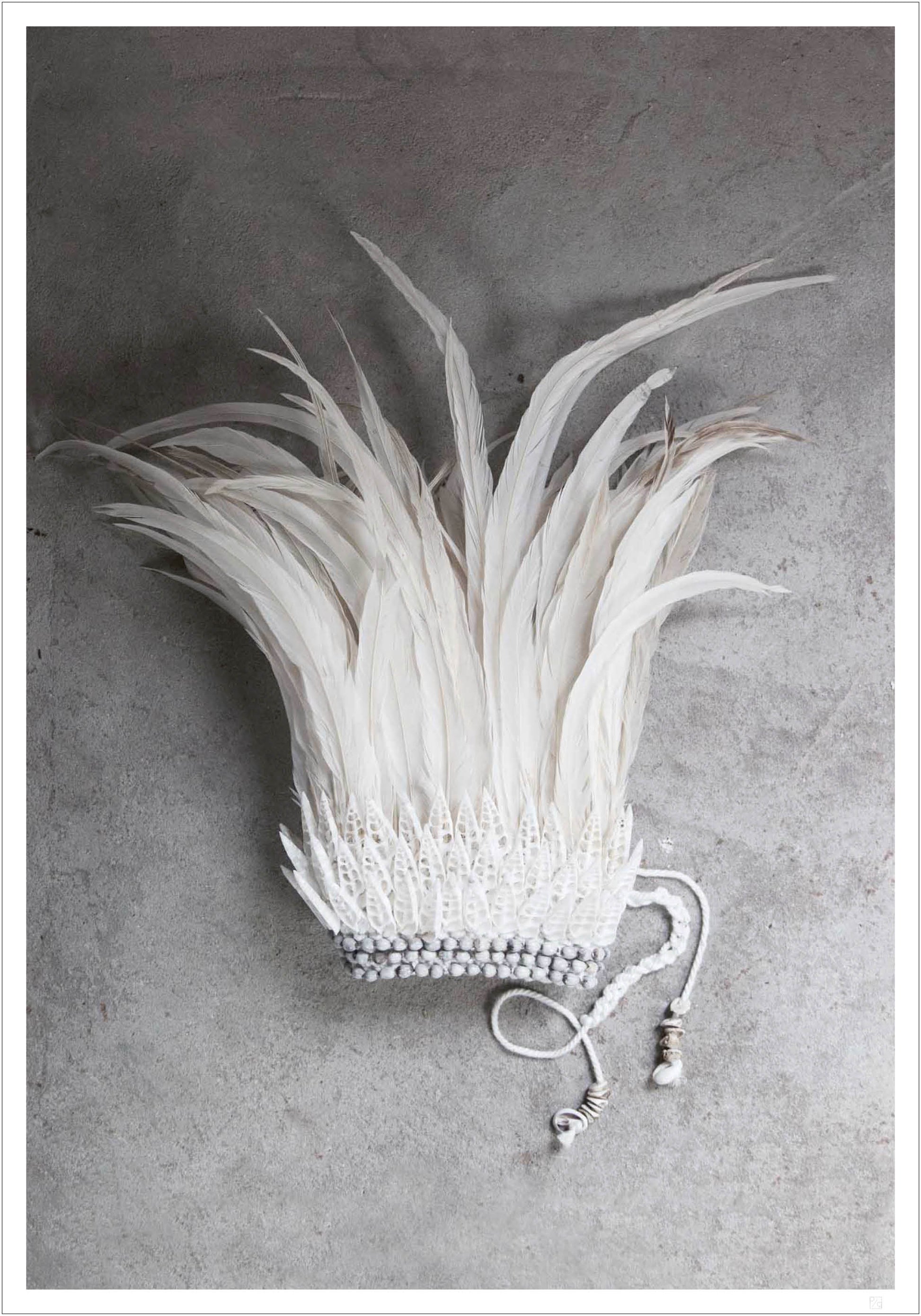 Schwarz-weiß Fotografie, die unsere klassische weiße Federkrone zeigt, bestehend aus weißen cremigen Federn und Muscheln. Dieser Druck lässt sich leicht mit jedem unserer anderen Poster kombinieren und wird ein schönes Detail an Ihrer Galeriewand schaffen.