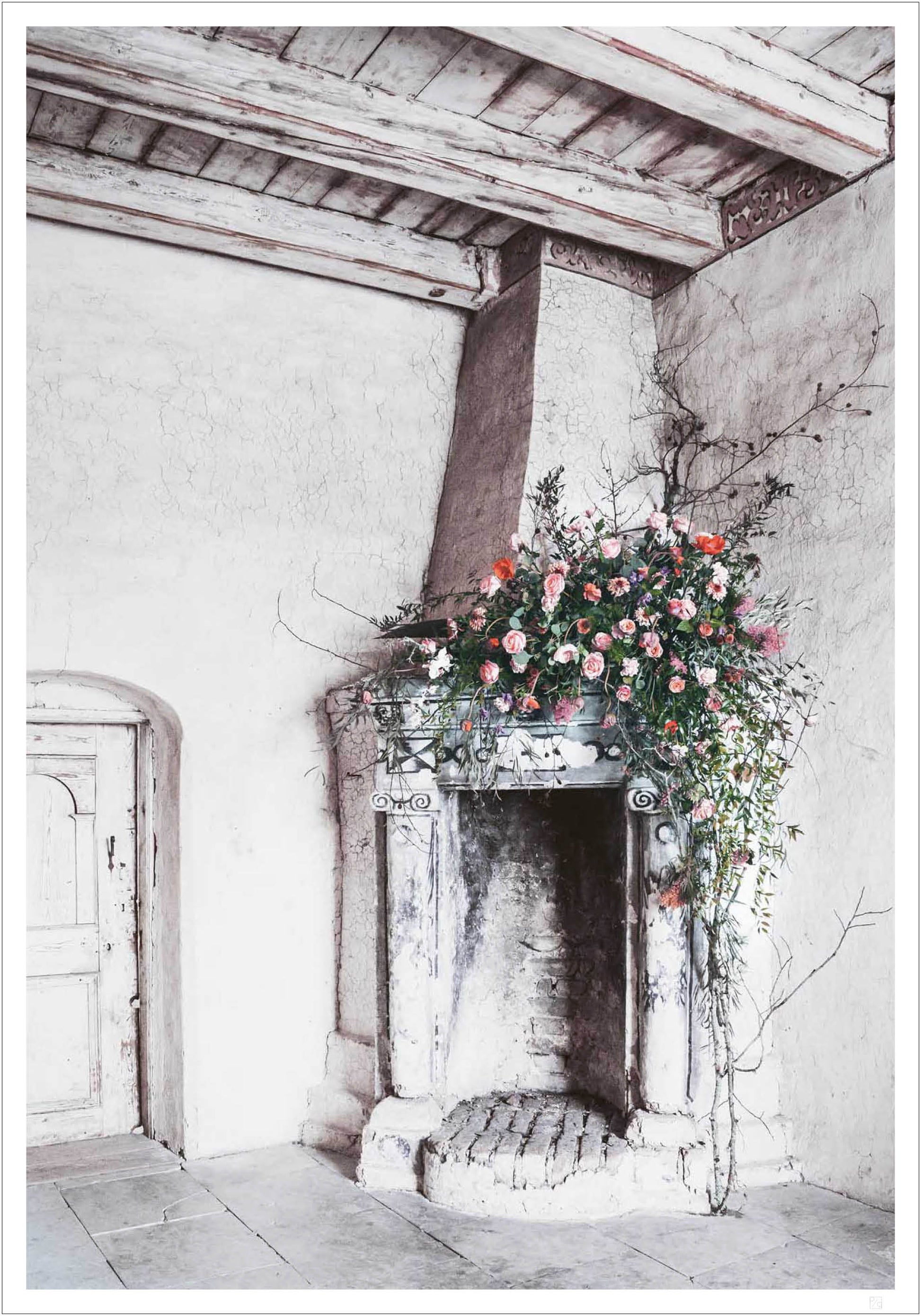 An old fireplace transformed into a celebration of life. Sparkling flowers rest delicately upon its aged stone, creating a striking contrast between history and vibrant beauty. Perfect for hanging near your own fireplace, this poster brings warmth, elegance, and a touch of poetry to any room.