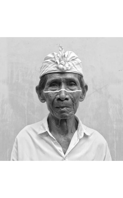 A man marked by time — his face etched with stories and wisdom, traced by a white line crossing his forehead and nose like a pathway through years lived fully. His head wrapped in a simple white cloth, tied like a crown of quiet dignity. A plain white shirt rests lightly on his shoulders — unadorned but deeply present.