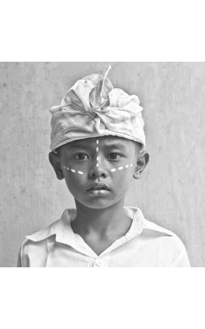 A young boy, his spirit bright and unyielding. A simple white cloth tied to his head, and a plain white shirt — symbols of purity and possibility. Five white dots trace a path from his forehead down his nose, and five more adorn each cheek, like whispers of ancient rites and future dreams.