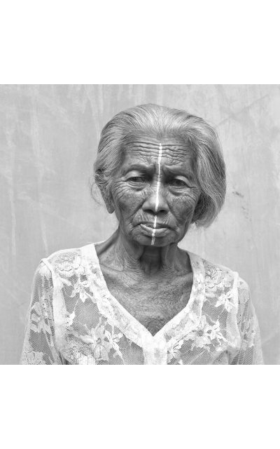 An elderly woman, wrapped in time — her face marked by the delicate etchings of a life fully lived. Her white hair is soft as breath, and she wears a white lace blouse, light as memory, strong as lineage.