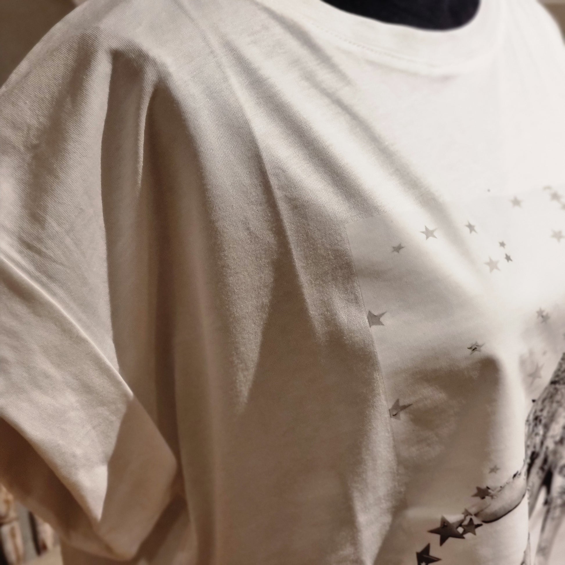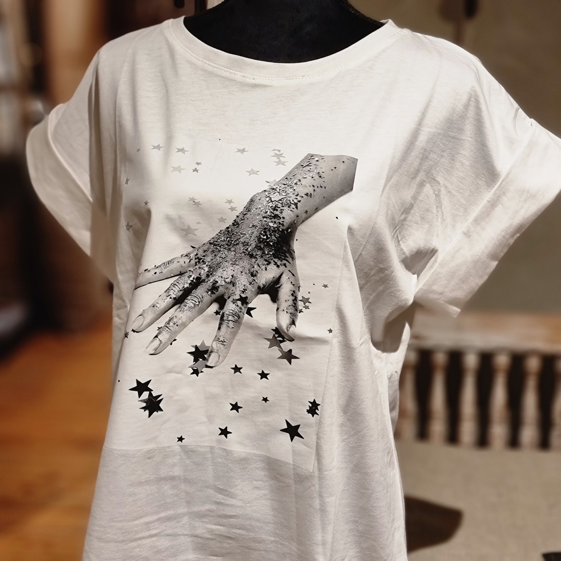 A soft whisper of magic, woven into every thread. Our Sprinkled Wishes T-shirt is crafted in Italy from 100% gentle cotton, shaped in our signature One Size fit that drapes like a quiet embrace. The folded sleeve edges add a touch of effortless elegance—simple, yet steeped in intention.