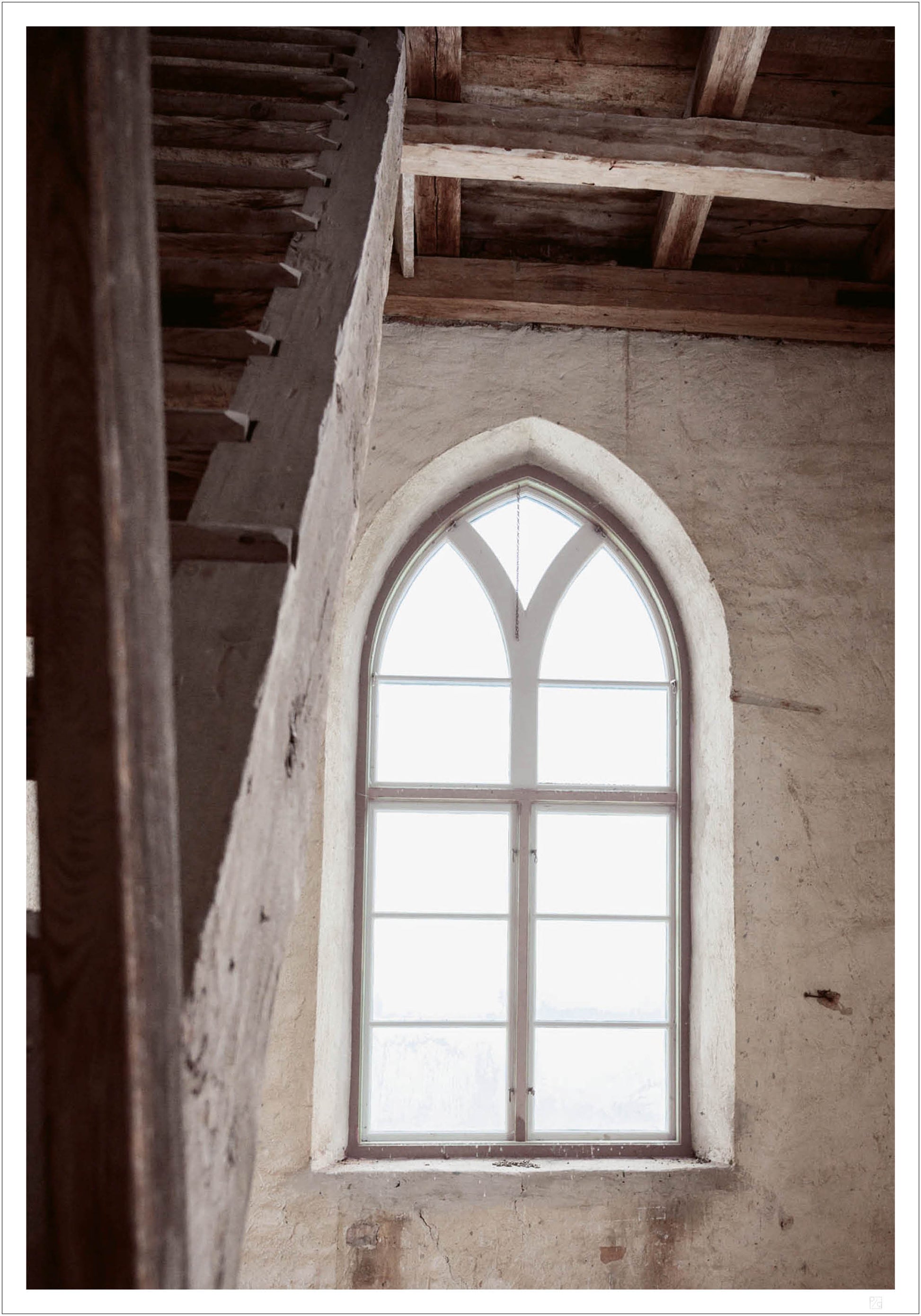 Gammal fönster- och trappaffisch med ett vintagefönster och en trappa i det gamla slottet Bogesund. Denna eleganta design kommer att se vacker ut i ditt hem.